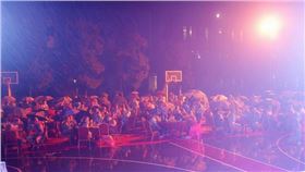 晚会尾声下起了瓢泼大雨,民众打伞观看演出